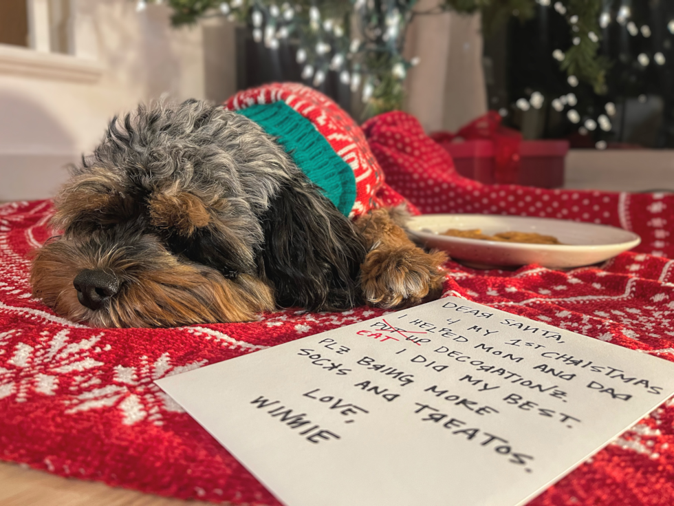 Our first year with Winnie has been a blast! She is a playful, snuggly, sassy little outdoor pup. She loves going on her daily walks to the park, or spending time with her Dad at his music school— getting attention from everyone who comes in. Her favorite hobby is to chase and be chased by all the dogs, big or small, at the dog park. She spends lots of time playing fetch, chewing on twisty bones, chasing ducks, and stealing socks. Her favorite snacks are peanut butter, cheese, apples, raw carrots, sausage, and ice cubes. Winnie has gone on many adventures already— to the beach, farmers markets, on play dates, and attended events all over the city and burbs— and next year she has plans to take rides with her Dad on his motorcycle, and even fly to France! Her daily mission is to steal Mom’s AirPods, burry her treasures in her blankies, do lots of tricks for treatos, and defend the house from enemy bunnies. She’s very good at her job— but even better at loving us. We have fallen so wildly in love with this precious, spotted, eye-cracklin’ girl— sometimes it takes our breath away. We could not feel more lucky and blessed to have her in our lives. She completes our little family perfectly.